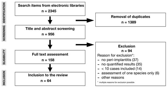 After removal of duplicate titles from different electronic libraries, 956 titles were retrieved for possible inclusion. Of these, 158 full texts were analyzed and further 95 studies were excluded for different reasons, such as no assessment of peri-implantitis (n = 37), missing quantification of the results (n = 35), inclusion of less than 10 samples (n = 14), assessment of only one single bacterial species (n = 6), or other reasons (Figure 1). For the screening process inter-rater reliability was 96% before discussion. Finally, data out of 64 studies on 3730 samples from peri-implant sites were extracted over a publication period from 1990 to 2019. More than 70% of these studies had been published in the past eight years. In the selected studies, different assessment methods were described, namely bacterial culture, PCR-based assessment, hybridization techniques, pyrosequencing, and transcriptomic analyses. While culture-dependent (44%) and hybridization techniques (44%) were the most frequently applied microbiological techniques for the studies published prior to 2011, culture-independent techniques, e.g., PCR, hybridization, pyrosequencing, and transcriptomics (42%), were predominantly described in studies published after 2011. Quality assessment revealed 9 studies of high, 25 of medium, and 30 of low quality, respectively (Table 1). In 59 out of 64 studies, sampling was performed using sterile paper points and/or curettes in the vast majority of cases. Few data were available regarding the type of investigated implants. A total of 17 studies, however, reported microbiological data on titanium implants.