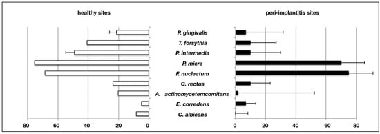 Moreover, reports on culture-based techniques did not reveal any specificity for the composition of biofilms from samples of peri-implantitis as compared to periodontitis or healthy implants, with the exception of the recovery of C. albicans only from healthy implants. Several studies support the existence of a higher microbial diversity in samples from healthy sites. Microbiological techniques that use specific DNA sequences, such as hybridization or PCR analysis, likewise, did not reveal a specificity of any species in health or disease. Only P. nigrescens and E. nodatum were identified more frequently in samples from peri-implantitis. Likewise, single studies indicated a high association of sub-clusters of Treponema spp. and Synergistetes spp. with peri-implantitis [30].