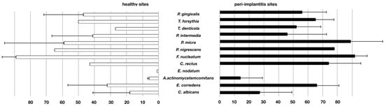 Frequency of positive detection in studies performing PCR-based assessment. Weighted percentages of positive assessment in samples from healthy and peri-implantitis sites (bars = means, whiskers = standard deviation).