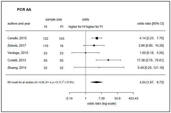 Meta-analysis for the presence of Aggregatibacter actinomycetemcomitans in either healthy sites or peri-implantitis sites (studies performing PCR-based analysis). HI—healthy implants, PI—implants with peri-implantitis, Q—Cochrane’s Q, df—degrees of freedom, p—level of significance, I2—proportion of observed variance (heterogeneity).