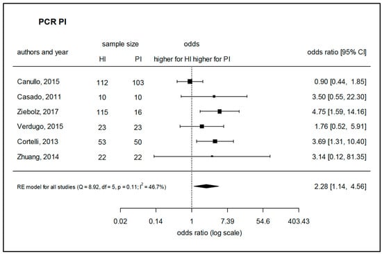 Meta-analysis for the presence of Porphyromonas gingivalis in either healthy sites or peri-implantitis sites (studies performing PCR-based analysis). HI—healthy implants, PI—implants with peri-implantitis, Q—Cochrane’s Q, df—degrees of freedom, p—level of significance, I2—proportion of observed variance (heterogeneity).