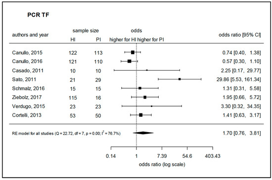 Meta-analysis for the presence of Tannerella forsythia in either healthy sites or peri-implantitis sites (studies performing PCR-based analysis). HI—healthy implants, PI—implants with peri-implantitis, Q—Cochrane’s Q, df—degrees of freedom, p—level of significance, I2—proportion of observed variance (heterogeneity).