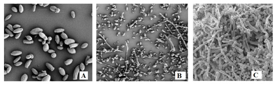 The concentration of yeasts detected in VOO depends on several factors, such as filtration, sedimentation, and the physicochemical composition. Filtration reduces the initial microbial concentration of VOO, which, in some cases, can be partially or completely restored by cell replication during storage. Although filtered oils contain fewer yeast species, some of them demonstrate the maximum colony forming units (CFUs) number of yeasts, ranging from 3.50 logs to 4.20 logs per mL [28,29]. Similarly, in unfiltered olive oils, the maximum CFUs number of yeasts ranged from 4.56 logs per mL in the newly produced olive oils and 3.03 logs per mL after one year of storage [30]. The survival of yeasts in the oily mass is conditioned by the water content and chemical composition of VOO [29,31,32]. The water content in VOOs varies from 0.15% (w/w) to over 0.36% (w/w), depending on the use of the oil extraction system and product filtration. However, water content above 0.25% (w/w) is considered high, because this not only promotes the growth of microorganisms, but also activates enzymes that are harmful to oil quality [33]. Depending on the concentration of the total polar phenolic compounds in VOO during storage, the physiological activity of yeasts is modified, exerting a strong selective pressure on the survival of yeast species. A study was performed with the Yamadazyma terventina 2092 dimorphic yeast strain, which was inoculated into VOO with a low or high phenolic compound content. Dimorphic yeasts demonstrate an equilibrium between spherical and polarized growth (pseudohyphal tip elongation), and this can be triggered while transitioning from favorable to unfavorable environmental conditions. In the previous study, the Y. terventina 2092 yeast strain was inoculated into VOO with different phenolic compound concentrations (100 mg and 350 mg caffeic acid equivalent (CAE) per kg) and stored at 15 °C for three months. Corn Meal Agar medium (CMA, Oxoid code CM 0103) was used for pseudohyphae production of Yamadazyma terventina 2092 dimorphic yeast strain. The yeast cells were extracted from the oil samples at the end of the incubation period and analyzed with a scanning electron microscope (SEM) according to Zullo et al. [29] The Y. terventina 2092 dimorphic yeast strain showed polarized growth only in the sample of VOO with a high total polar phenolic content equal to 350 mg CAE per kg (Figure 1).