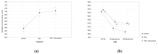 Hgb dropped significantly on the 3rd postoperative day, as expected in all groups (Tukey HSD test, p < 0.001 for all groups), with a bigger drop in Group C than in Groups A and B (Table 2, Figure 1). Specifically, Hgb decreased by 3.3 ± 1.8 gr/dL in Group C, 2.5 ± 0.7 in Group A and 2.4 ± 1 in Group B, respectively (Tukey HSD, p < 0.001 for both comparisons). There was no difference in Hgb drop at the 3rd postoperative day between Groups A and B (Tukey HSD test, p = 0.811), supporting our hypothesis that the addition of vancomycin does not affect the topical action of TXA. Table 2 presents the mean Hgb values in all three groups preoperatively, on days 1 and 3 postoperatively (Figure 1).