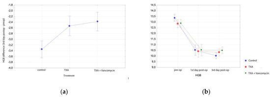 Hgb dropped significantly on the 3rd postoperative day in all three groups (Tukey HSD test, p < 0.001 for all groups). Hgb drop was greater in Group C than in Groups A and B. (Table 2, Figure 2). Hgb decreased by 2.8 ± 1.1 gr/dL in Group C, while it decreased only 1.9 ± 1.1 in Group A and 1.8 ± 0.9 in Group B, respectively (Tukey HSD, p < 0.001 for both comparisons). There was no difference in Hgb drop on the 3rd postoperative day between Groups A and B (Tukey HSD test, p = 0.720), supporting again our hypothesis that the addition of vancomycin does not affect the topical action of TXA (Figure 2).