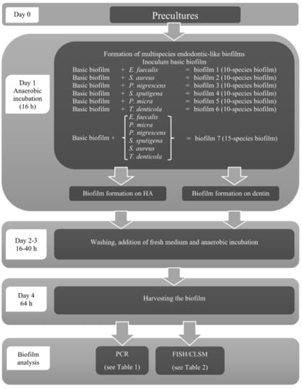 All strains, except for T. forsythia and T. denticola, were maintained on Columbia blood agar. Tannerella forsythia and T. denticola were maintained in T. forsythia medium, containing per liter solution: 37 g brain-heart-infusion, 10 g yeast extract, 1 g cysteine, 5 µL/mL hemin, 20 µL/mL N-acetylmuramic acid, 2 µL/mL menadione and 5% horse serum. Prior to the onset of biofilm experiments, all strains were transferred into adequate liquid media (mFUM [], BHI and T. forsythia medium) and incubated anaerobically at 37 °C for two cycles of precultures (16 h and 8 h, respectively). Prior to biofilm inoculation, all strains were adjusted to a defined optical density (OD550 = 1.0) and mixed in equal volumes. Biofilms were cultivated in 24-well polystyrene cell culture plates on sintered hydroxyapatite (HA; Ø 9 mm, Clarkson Chromatography Products, Inc., South Williams-port, PA 17702, USA) and dentin discs (Ø 7 mm, bovine teeth) that had been preconditioned (pellicle coated) for 4 h, with shaking (95 rpm) in 0.8 mL saliva (whole unstimulated saliva, pooled from individual donors [], 1:2 diluted with sterile 0.25% NaCl solution; for the preparation of batches of pooled, processed, and pasteurized saliva, see Guggenheim et al. []. The pellicle-coated discs were equilibrated for 45 min at 37 °C in the anaerobic chamber in 1.6 mL growth medium (containing 960 μL undiluted saliva, 160 μL fetal bovine serum (FBS), and 480 μL mFUM + 0.3% glucose. Finally, the 200 μL bacterial suspension, consisting of equal volume and density (adjusted OD550 = 1.0) of each strain was given to each well, and the biofilm was incubated for 64 h under anaerobic conditions. At 16 and 40 h, the discs were washed 3 times with 2 mL of 0.9% NaCl (two dippings each) and transferred to fresh media in the 24-well plate. After 64 h the discs were washed again as previously and either proceeded to staining and confocal laser scanning microscopy (CLSM) or transferred into a 50 mL Falcon tubes with 1 mL of physiological NaCl and vortexed for 3 min in order to remove the biofilm from the discs, prior to the transfer to 5 mL Falcon tube and sonication at 30 W for 5 s (Sonifier B-12, Branson Ultrasonic, Urdorf, Switzerland). Then, the harvested biofilm suspension was prepared for quantification by real-time quantitative PCR (qPCR). For fluorescence in situ hybridization (FISH) and CLSM analyses biofilms were fixed in 1 mL of 4% paraformaldehyde + RNase inhibitor (RNAi) for two hours at 4–8 °C (Figure 1).