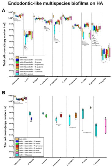 Boxplots demonstrating cell counts per endodontic-like biofilm on pellicle-coated hydroxyapatite discs after analysis by qPCR. To form endodontic-like multispecies biofilms, a total of six bacterial species were added separately to a “basic” nine-species subgingival biofilm. x-axis of panal (A) shows the strains of the “basic biofilm” (in the first column total counts (beige) as a control group are shown), while x-axis of panal (B) shows in the first column total counts (beige) again, as well as the strains of the endodontic species (E. faecalis (blue), S. aureus (dark green), P. nigrescens (red), S. sputigena (orange), P. micra (light green) and T. denticola (pink)). Statistically significant differences between the biofilm with additional strains and the control group (“basic biofilm” or endodontic-like biofilm) is marked with 1–4 asterisks (* p < 0.05; ** p < 0.01; *** p < 0.001). The internal line represents the median; the whiskers indicate minimum and maximum. The p values (p ≤ 0.05) of the significantly different data are provided. Data derive from three independent experiments, each represented in triplicate biofilm cultures (n = 9).