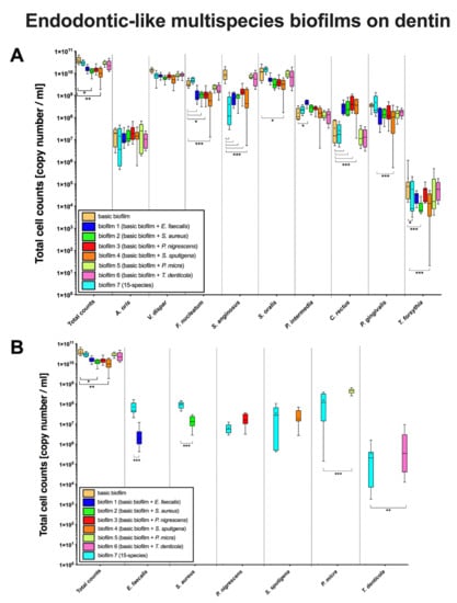 Boxplots demonstrating cell counts per endodontic-like biofilm on dentin discs after analysis by qPCR. To form endodontic-like multispecies biofilms, a total of six bacterial species were added separately to a “basic” nine-species subgingival biofilm. The x-axis of panal (A) shows the strains of the “basic biofilm” (in the first column total counts (beige) as a control group are shown), while the x-axis of panal (B) shows in the first column total counts (beige) again, as well as the strains of the endodontic species (E. faecalis (blue), S. aureus (dark green), P. nigrescens (red), S. sputigena (orange), P. micra (light green) and T. denticola (pink)). Statistically significant differences between the biofilm with additional strains and the control group (basic biofilm or all species biofilm) is marked with 1–4 asterisks (* p < 0.05; ** p < 0.01; *** p < 0.001). The internal line represents the median; whiskers indicate minimum and maximum. The p values (p ≤ 0.05) of the significantly different data are provided. The data were derived from three independent experiments, each represented in triplicate biofilm cultures (n = 9).