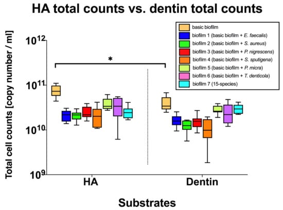 Boxplots demonstrating total cell counts per endodontic-like biofilm on HA and dentin discs after analysis by qPCR. To form endodontic-like multispecies biofilms, a total of six bacterial species were added separately to a “basic” nine-species subgingival biofilm. The x-axis shows endodontic-like biofilms on HA and dentin discs. Statistically significant differences between the total counts of the two substrates is marked with 1–4 asterisks (* p < 0.05). The internal line represents the median; whiskers indicate minimum and maximum. The p values (p ≤ 0.05) of the significantly different data are provided. The data were derived from three independent experiments, each represented in triplicate biofilm cultures (n = 9).