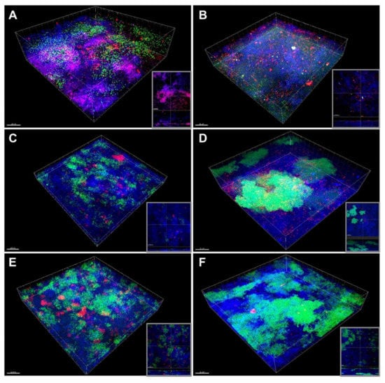 Confocal laser scanning microscopy (CLSM) 3D reconstructions and image stacks (insets) of endodontic-like biofilms grown on HA discs following fluorescence in situ hybridization (FISH) using FITC- and Cy3-labelled probes (see Table 2). To form endodontic-like multispecies biofilms, a total of six bacterial species were added separately to a “basic” nine-species subgingival biofilm. The resulting biofilms 1–6 contained additionally E. faecalis (A), or S. aureus (B), or P. nigrescens (C), or P. micra (D), or S. sputigena (E), or T. denticola (F). Prevotella intermedia appears green (FITC-labeled) and the newly added bacteria appear red (Cy3-labeled). Non-hybridized bacteria appear blue due to DNA staining (YoPro 59). Scale bar = 10 µm.