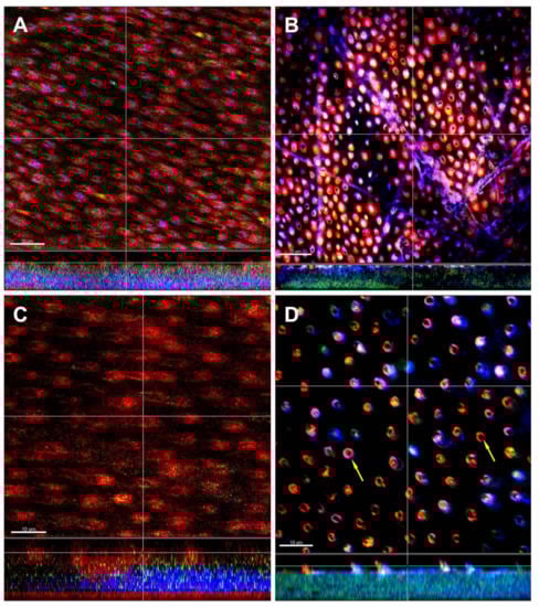 Confocal laser scanning microscopy (CLSM) image stacks of the basic nine species biofilm grown on dentin discs containing additionally Enterococcus faecalis (A), or Staphylococcus aureus (B), or Selenomonas sputigena (C), or Prevotella nigrescens (D). Due to FISH staining of biofilms using FITC- and Cy3-labelled probes (see Table 1), Prevotella intermedia appears green (FITC-labeled) and the newly added bacteria appear red (Cy3-labeled). Non-hybridized bacteria appear blue due to DNA staining (YoPro 59). Images were taken at the biofilm base showing dentinal tubules. The arrows indicate bacteria adhered in tubules. Scales = 20 µm (A,B) and 10 µm (C,D).
