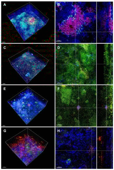 Confocal laser scanning microscopy (CLSM) 3D reconstructions of the endodontic-like 15-species biofilms grown on HA discs following fluorescence in situ hybridization (FISH). To form endodontic-like multispecies biofilms, a total of six bacterial species were added to a “basic” nine-species subgingival biofilm. The resulting endodontic-like 15-species biofilms contained F. nucleatum (light blue; FITC-labeled) and P. intermedia (red; Cy3-labeled) (A,B); E. faecalis (green; FITC-labeled), P. micra (red; Cy3-labeled), S. aureus (yellow; ROX-labeled) (C,D); P. nigrescens (green; FITC-labeled), S. sputigena (red; Cy3-labeled), T. denticola (white; ROX-labeled) (E,F); P. gingivalis (green; FITC-labeled), T. forsythia (red; Cy3-labeled), P. intermedia (purple; ROX-labeled), F. nucleatum and C. rectus (blue; Cy5-labeled) (G,H). In images (A–F), non-hybridized bacteria appear blue due to DNA staining (YoPro 59). Scale bar = 10 µm (A–E,G) or 20 µm (F,H).