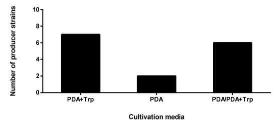 To further confirm the fungal production of IAA, samples were subjected to HPLC-MS/MS analysis, in which pure IAA was used as standard. In this experiment, certain extracts that originated from ferment broth or the mycelia of the examined strains cultured in the presence or absence of Trp contained IAA. Comparing the IAA production results of the plate assay and the HPLC-MS/MS measurements, in several cases, the gathered data did not correspond exactly with each other, which were also found in the case of endophytic bacteria reported in the literature [41]. Thus, it could be concluded that the plate assay is applicable rather as a pre-screening for the indication of the IAA production than the exact determinations due to the possibility of false positive results.