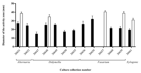 During the siderophore detection assay, twelve endophytes caused orange/yellow zones around their colonies on CAS agar plates as a result of their siderophores sequestering and binding iron from the medium (Figure 2). The largest zone appeared on the plate of the Fusarium sp. SZMC 26658 strain, but also high siderophore productions were detected at the Fusarium sp. SZMC 26656 and at the Alternaria sp. SZMC 26651.