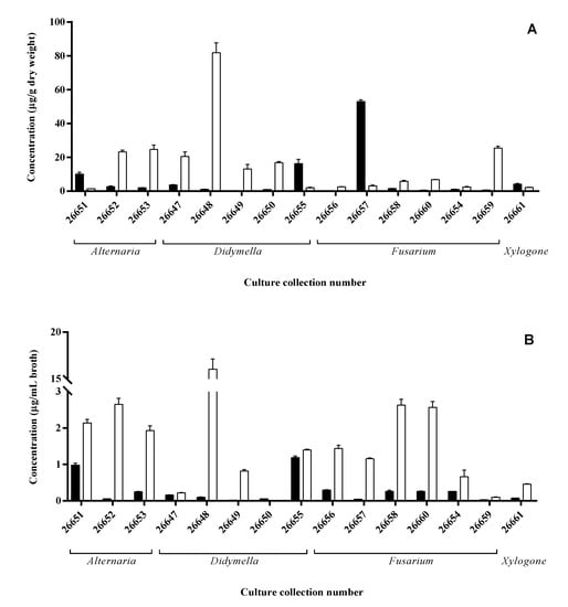 Similar to the results of the plate assays, each isolate showed remarkable IAA production either via the Trp-dependent or Trp-independent pathway (Figure 3). In the case of mycelial extracts, three strains accumulated a remarkable amount (>10 µg/g dry weight) of IAA in the PDB media including a Fusarium (SZMC 26657), a Didymella (SZMC 26655) and an Alternaria (SZMC 26651) isolate, while seven strains proved to be an outstanding producer on the media supplemented with additional Trp source reaching up to 82 µg/g dry weight at the Didymella (SZMC 26648) isolate (Figure 3A).