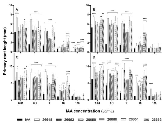 Primary root growth of 6- (A), 7- (B), 8- (C), and 9-day-old (D) A. thaliana plants after treatment with standard solutions and endophyte extracts at different IAA concentration levels. Significance is assessed based on p-values: * p ≤ 0.05; ** p ≤ 0.01; *** p ≤ 0.001 and **** p ≤ 0.0001.