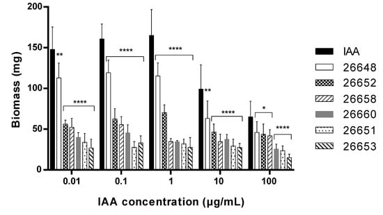 Biomass of 15-day-old Arabidopsis thaliana plants after treatment with the ferment broth extracts of selected endophytes diluted to five concentration levels based on their IAA content. The IAA standard was used for the control plants. Significance is assessed based on p-values: * p ≤ 0.05; ** p ≤ 0.01; *** p ≤ 0.001 and **** p ≤ 0.0001.