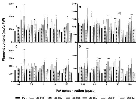 Pigment content of 15-day-old A. thaliana plants after treatment with ferment broth extracts of selected endophytes diluted to five concentration levels based on their IAA content: chlorophyll-a (A), chlorophyll-b (B), total chlorophylls (C) and carotenoids (D). IAA standard was used for the control plants. Significance is assessed based on p-values: * p ≤ 0.05; ** p ≤ 0.01; *** p ≤ 0.001 and **** p ≤ 0.0001.