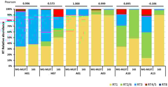Set B represented populations with varying relative abundances of multiple RT groups that were randomly generated. The predictions of 100 populations of Set B by STRUCTURE all highly correlated with the expected results, with a Pearson’s correlation of 0.992–1.000 (Figure S2). Five representative communities from Set B are shown in Figure 1.