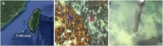 The location of and the sampling area in the cold seep. (A) The location of the cold seep is indicated. (B) The representative animal communities in the cold seep. Bathymodiolus platifrons and Shinkaia crosnieri are indicated with the blue and red arrows, respectively. (C) Sediment samples were collected using a pushcore.