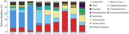 The diversity and distribution of microbial sequence tags in the libraries of seawater samples. Libraries of the seawater of animal community (WAC) are indicated by WAC-1, WAC-2, and WAC-3; libraries of the seawater closely above the seepage (WCAS) are indicated by WCAS-1, WCAS-2, and WCAS-3; libraries of the seawater far above (60 m, 120 m, and 220 m) the seepage (WFAS) are indicated by WFAS-1, WFAS-2 and WFAS-3. The sequence tags were generated with the next-generation sequencing (NGS) platform and classified at the phylum/class level. Each color represents the percentage of the taxon in the total assemblage. The top 10 groups in each sample are labeled, and other groups are integrated as “Others”.
