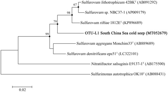 The maximum-likelihood phylogenetic tree based on nearly complete 16S rRNA gene sequences (1388 bp) showing the positions of operational taxonomic unit—L1 (OUT-L1) from this study, members of Sulfurovum, and representatives of some other related taxa. GenBank accession numbers are shown in parenthesis. Filled circles indicate that the corresponding nodes were also recovered in the trees generated with the neighbor-joining and maximum-parsimony algorithms. Only bootstrap values (expressed as percentages of 1000 replications) equal or greater than 50% are shown at the branching points. Sulfurimonas autotrophica OK10T (GenBank accession number, AB088431) was used as an outgroup. Scale bar, 0.02 substitutions per nucleotide position.