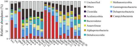 SBa was 14 cm long and equally divided into 7 layers named SBa0-2 (meaning 0–2 cm, the same for below), SBa2-4, SBa4-6, SBa6-8, SBa8-10, SBa10-12, and SBa12-14. Campylobacterota was overwhelmingly dominant in the top layer of SBa0-2 (73.9%), but was low in abundance in the deeper layers of 2 cm to 14 cm (5.4–15.5%) (Figure 4). On the contrary, Deltaproteobacteria, Methanomicrobia, and Dehalococcoidia were rare in the top layer but abundant in the subsurface. The abundance of Deltaproteobacteria in the first layer was 3.1%, which rose up to the highest percentage of 22.2% in the fourth layer, and then declined to 11.3% in the bottom layer (Figure 4). The abundance of Methanomicrobia was 1.3% in the top layer and increased in the subsurface, reaching up to the highest level of 13.4% in SBa10-12 (Figure 4). The abundance of Dehalococcoidia was 0.9% in the top layer, and ascended with depth, reaching up to 21.4% in the bottom layer of SBa12-14 (Figure 4).