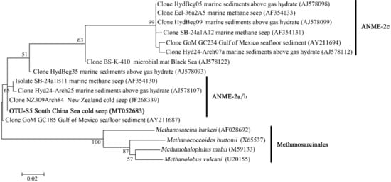 - Niu, M.; Fan, X.; Zhuang, G.; Liang, Q.; Wang, F. Methane-metabolizing microbial communities in sediments of the Haima cold seep area, northwest slope of the South China Sea. FEMS Microbiol. Ecol. 2017, 93. [Google Scholar] [CrossRef]