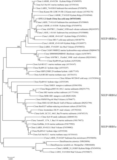 In the OTU level, most Campylobacterota tags (85.5%) in SBa and SBb were classified as OTU-S1, which indicated that OTU-S1 was dominant in the surface sediment communities. Consistent with the NGS amplicon sequencing results, the Pacbio amplicon sequencing data showed that Campylobacterota was dominant in SBb, most of which were classified as OTU-L1 that accounted for 98.1% and 96.0% in SBb0-2 and SBbB4-6, respectively (Supplementary Figure S2). These results indicated that Sulfurovum was dominant in the surface sediments. In the middle and bottom layers, Methanomicrobia was abundant, and the most abundant OTU was OTU-S5. Phylogenetic analysis indicated that OTU-S5 was clustered in the ANME-2 a/b group (Figure 5), suggesting an involvement in methane oxidation. Deltaproteobacteria was also abundant in the middle and bottom layers, and the most abundant OTU was OTU-S7. In the Pacbio amplicon sequencing data, OTU-L2 was highly similar to OTU-S7 (only 4 bp difference) and was used to perform phylogenetic analysis, which showed that OTU-L2 was clustered within the SEEP-SRB1a group (Figure 6) that is usually viewed as a partner of ANME2 [46].