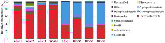 Diversity and distribution of microbial sequence tags in animal-associated libraries. SC-G1 SC-G2, SC-G3, and SC-G4 represent the libraries of the gills of Shinkaia crosnieri; BP-G1, BP-G2, BP-G3, BP-G4 represent the libraries of the gills of Bathymodiolus platifrons. The sequence tags were generated with the next-generation sequencing platform and classified at the phylum/class level. Each color represents the percentage of the taxon in the total assemblage. The top 10 groups in each sample are labeled, and other groups are integrated as “Others”.