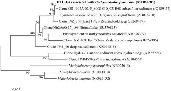 In the gills of B. platifrons, Gammaproteobacteria and Campylobacterota dominated the microbial communities, with average percentages of 56.8 ± 11.1% and 40.6% ± 10.8 %, respectively (Figure 7). The other groups were scarce (<1% in percentage). In OTU level, most Gammaproteobacteria tags were classified into OTU-S5 and OTU-S958, accounting for 33.8 ± 7.4% and 21.3 ± 4.3% of the gill communities, respectively. The majority of the Campylobacterota tags (87.2%) were classified into OTU-S4. In the Pacbio amplicon sequencing data, Gammaproteobacteria was dominant with an overwhelming percentage of 89.3 ± 2.3%, while Campylobacterota was 10.0 ± 2.0% in percentage (Supplementary Figure S4). In OTU level, nearly all Gammaproteobacteria subreads (96.8%) were classified into OTU-L3. OTU-L3 was completely identical to OTU-S5 in their shared region, and differed from OTU-S958 in five bases. Phylogenetic analysis indicated that OTU-L3 was clustered together with methane-oxidizing bacteria found in both deep-sea animals, such as mussels, and environmental samples, such as cold seep sediments (Figure 8). The majority of Campylobacterota tags (90.0%) were classified into OTU-L9, which was phylogenetically clustered into the group of bacteria that were specifically associated with deep-sea mussels (Figure 9) and represented a new family [21].