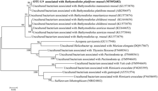 A large number of Gammaproteobacteria and a small amount of Campylobacterota existed in the gills of B. platifrons, which was similar to the findings of a previous study [13]. Phylogenetic analysis indicated that most Gammaproteobacteria belonged to the methane-oxidizing bacterial group, while most Campylobacterota belonged to a new family of Bathymodiolinae-associated bacteria, which is unknown in function [21]. OTU-L3, which represented nearly all Gammaproteobacteria subreads, had high identities to the clones from various samples, including those from mussels and cold seep sediments, suggesting a possible horizontal transfer of these bacteria from local environments to animal inhabitants. Conversely, for the main Campylobacterota represented by OTU-L9, its close relatives were almost exclusively associated with mussels, indicating the possibility of vertical transmission.