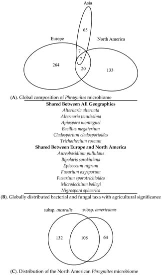 3.7. Geographic Distribution of the Published Phragmites Microbiome