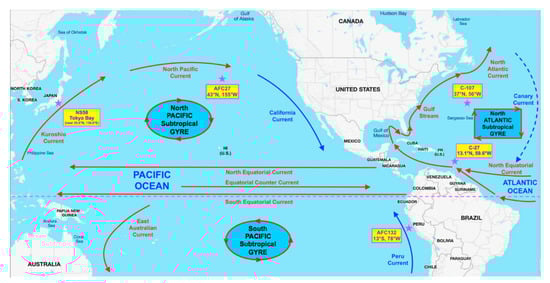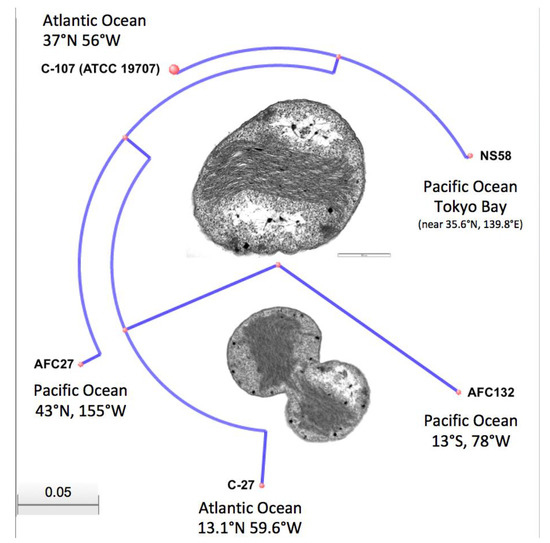 Strains used in this study were initially isolated as enrichment cultures from different oceanic gyres (Figure 1): C-107 from the open North Atlantic; C-27 from the coastal waters of the Southern North Atlantic; AFC132 from the South Pacific Gyre; and AFC27 from the East end of the North Pacific Gyre [3]. The enrichments were obtained under an agreement in the Nitrification Network collaborative from Bess B. Ward (Princeton University, Princeton, NJ, USA) and then isolated into pure culture in our lab using enrichment and growth conditions as described previously [1,2,34,35]. In brief, all N. oceani strains were maintained at 30 °C in the dark without shaking in liquid ammonium mineral salts media [34] amended with hydroxylamine at 100 µM final concentration to eliminate contamination [1]. The pH of cultures was adjusted daily to 8.0 using K2CO3 [2,34]. Cultures were propagated monthly by transferring 5-mL aliquots of culture into 100 mL of fresh media. Cells were checked under a light microscope at 1000× magnification routinely for uniform cell morphology [35]. As recently described by Dohra et al. [32], N. oceani strain NS58 was isolated into pure culture from Tokyo Bay sediment at the West East end of the North Pacific Gyre, which is clockwise connected to the location of AFC27 by the Kuroshio and North Pacific currents as well as the California and North Equatorial Currents (Figure 1).