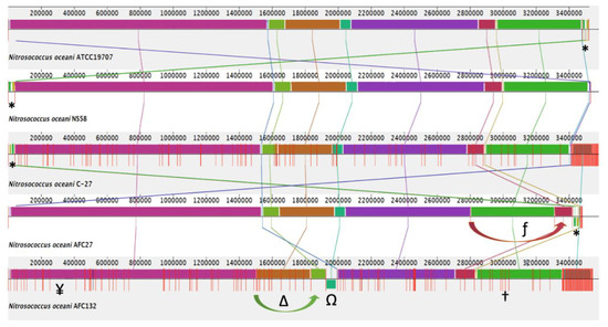 Alignment of the genome sequences from five Nitrosococcus oceani strains C-107, NS58, C-27, AFC27, and AFC132, using Mauve 2.4 [37], the progressiveMauve aligner [40], and the Mauve Contig Mover module [39]. *, Plasmid A sequence; Ω, inverted AFC132 contig_72; ∆, translocated AFC132 contig_71; ƒ, translocated AFC27 contig_NS_D5995302.1; †, NiFe-hydrogenase metallocenter assembly protein HypFCDE on AFC132 contig_122 (3,080,491–3,085,122); ¥, MbtH family NRPS protein HW44_RS01565 (344,153–344,419).