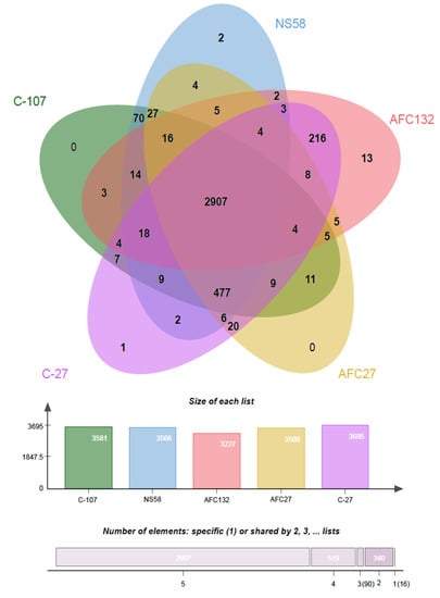 An analysis of orthologous gene clusters (OrthoVenn2 [43]) revealed that a core of 2907 orthologous genes are shared among the genomes of the five N. oceani strains (Figure 5). In addition, the number of orthologous gene clusters present in the genomes of C-107, NS58, C-27, and AFC27 but absent from the genome of AFC132 is 477 (Figure 5).
