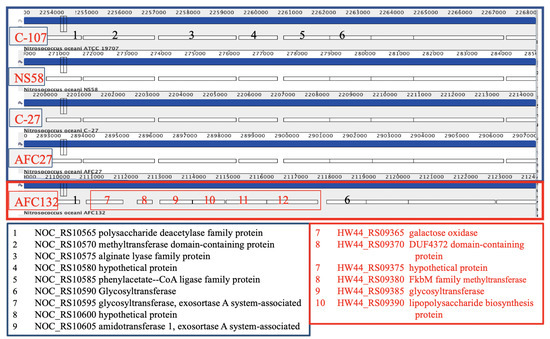 All N. oceani genomes encode a large complement of glycosyl transferases and inventory involved in polysaccharide biosynthesis; however, there are differences between the strains with regard to extent and location (Figure 6). For example, the gene encoding a capsular polysaccharide (phenylacetate–CoA ligase family protein CDS in the genome of strain C-107 (NOC_RS10585, labeled “5” in Figure 6)) is predicted by the DOOR2 database [95] to be part of an operon containing glycosyl transferase genes. NOC_RS10585 and four preceding genes are replaced in the in AFC132 genome by a longer gene cluster containing genes encoding sulfotransferase, methyltransferase, glycosyl transferase, and inventory implicated in polysaccharide biosynthesis.