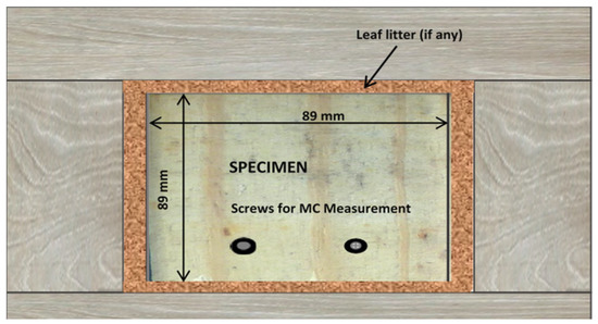 Physical configuration of specimen holder used in this study. The wood block was surrounded by either aged or leaf litter and allowed to weather. Black holes near the bottom were used to obtain moisture content at each observation. The assembly shown represents one replicate.