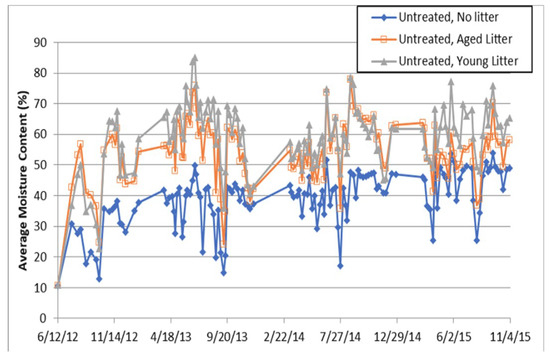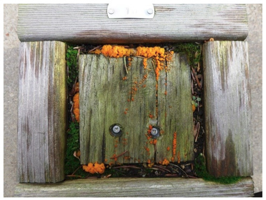 It is likely that the lower moisture contents in the treated specimens reflect differences in wood properties rather than an effect of the preservative treatments. Specimens cut from one of the treated parent boards contained heartwood, and these specimens consistently produced relatively low moisture content readings. In general, the moisture readings indicate that the specimens placed in contact with leaf litter had moisture contents conducive for the growth of decay fungi [53,54,55,56]. Decay fungi require a moisture content of at least 20% to sustain any growth, and higher moisture contents (over 29%) are required for initial spore germination [14,57]. For optimal growth, brown and white rot decay fungi typically prefer wood in the moisture content range of 40–80% [58,59]. Soft rot fungi, however, tend to prefer these conditions for colonization and growth [60], which can also severely decay wood under these conditions.
