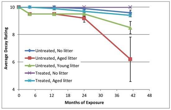 Average decay rating (n = 5) of above-ground wood samples in different exposure scenarios. For comparative purposes, treated wood both with and without litter are included in this figure but not discussed in the manuscript. Note faster rate of decline in decay rating of untreated wood in contact with aged litter compared to both young litter and litter free exposure scenarios.