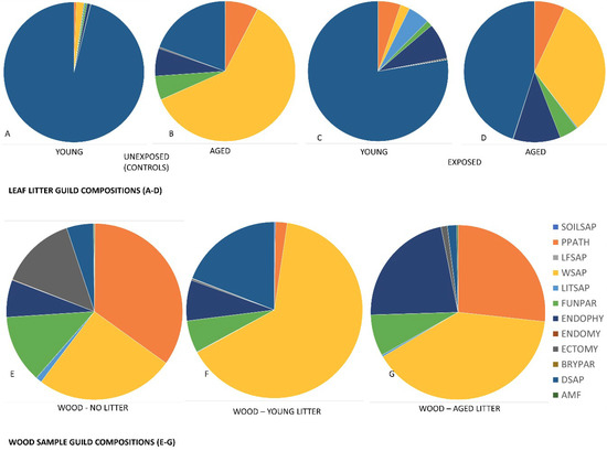 Guild composition of fungi under 7 different exposure scenarios. (A) Young litter prior to exposure, (B) aged leaf litter prior to exposure, (C) young litter after exposure, (D) aged litter after exposure, (E) wood with no leaf litter in contact, (F) wood exposed to young leaf litter, and (G) wood exposed to aged leaf litter. Note differences in relative proportion of fungal guilds and increased proportion of wood saprophytes (WSAP) between young and aged litter and wood exposed to both young and aged litter. Functional guild assignments performed using FungGuild [52]. Figure legends to the right are defined in the text.
