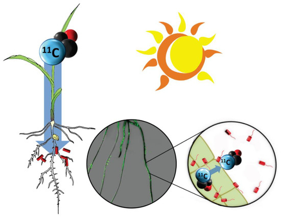 Concept of plant-borne carbon tracing to root-associating rhizobacteria. Atmospheric carbon is traced from plant fixation of radioactive 11CO2 through root translocation as complex 11C-photosynthates. There, that carbon source is assimilated by root-associating microorganisms. The center insert shows an overlay of images from 11C-radiography (dark black regions reflect high levels of 11C activity) and a green fluorescence image arising from RAM10, a green fluorescent protein (GFP) reporting strain of H. seropedicae bacteria. Regions of high root colonization seem to draw more 11C.