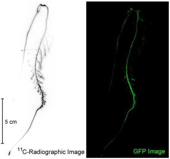 A comparison of the same root subjected to 11C-radiographic imaging and GFP imaging on the Typhoon 9000. Using nuclear-based and optical-based imaging, we were able to identify regions of high 11C-activity and bacteria colonization.