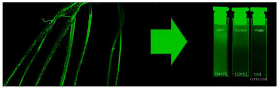Workflow showing green fluorescence imaging to identify regions of root tissues with highest levels of root colonization by RAM10, H. seropedicae, bacteria. Isolated 4-cm portions of root were subjected to sonication in saline solution to mechanically remove bacteria. The extract was re-imaged using the GFP signature of the microorganisms to quantify bacteria content in the liquid extract. Background corrections were made in each set of measurements using a deionized water sample. Non-inoculated control roots exhibited a trace amount of fluorescence signal attributable to naturally fluorescent plant metabolites.