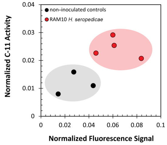 The plot of 11C-activity against the fluorescence signature from root sonication washes (Figure 4) exhibited a clear clustering of data around the presence or absence of RAM10 H. seropedicae. In general, the presence of H. seropedicae resulted in 2.5-fold higher 11C activity values and 2.2-fold higher fluorescence values than non-inoculated control roots. We note that non-inoculated control roots exhibited a small amount of both 11C-activity and fluorescence. Plants possess a natural autofluorescence signature attributable to the numerous secondary metabolites that contain fluorophores [26]. Hence, the small level of activity and fluorescence may reflect some amount of root exudates that were not removed during the initial root rinsing in deionized water.