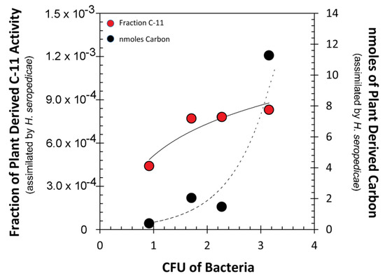 Representation of 11C assimilated in bacteria as a function of bacterial concentration (CFU) calculated from plated samples of tissue extract. The left-side axis presents plant-borne carbon assimilation as the fraction of 11C in the entire plant. Activity data was normalized for different 11C-allocation values due to variable root mass. The right-side panel presents a different perspective where the absolute activity values (in disintegrations per minute) were re-calculated in molar mass units. Raw data that generated this figure and the calculations used to arrive at final values can be found in Supplementary Table S1.