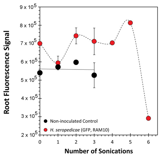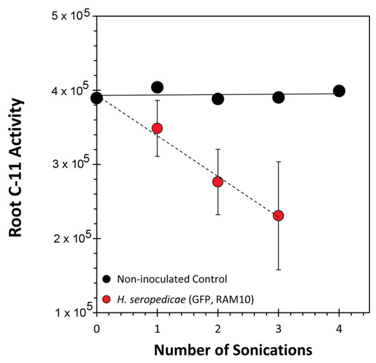 11C-Activity measurements of serially sonicated paraffin end-capped roots. Data from H. seropedicae inoculated roots represent average values (n = 3) ± SE. Data from the non-inoculated root represents a single sample. All 11C-activity data was decay corrected back to a common time point.