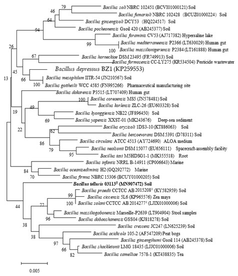 Neighbour-joining phylogenetic tree based on the 16S rRNA gene sequence of strain 03113T and other closely related Bacillus species. The significance of each branch is indicated by a bootstrap value (%) calculated for 1000 subsets. Genbank accession numbers are given in parentheses. Bar, 0.005 substitutions per nucleotide position. Isolating source label has been annotated in the back.