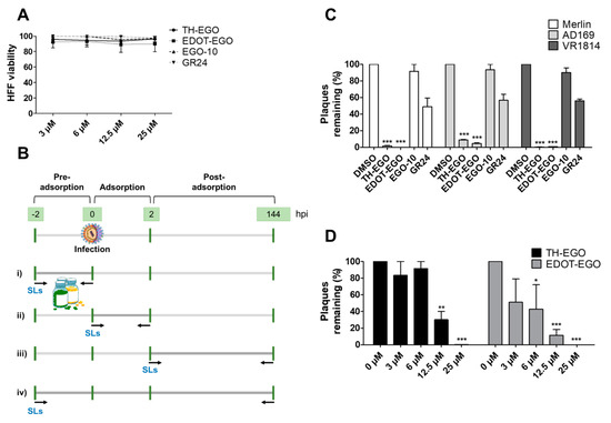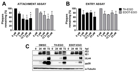 In order to gain more insight into the nature of the antiviral activity of the selected SL analogs, the effects of TH-EGO and EDOT-EGO were investigated during the HCMV replication cycle. To investigate if the compounds may target the early steps of the virus life cycle, i.e., virus attachment and entry into cells, an attachment assay was first carried out under experimental conditions in which the virus was allowed to bind to the surface of the host cells, in the presence or absence of SLs, but did not undergo cell entry. Briefly, pre-chilled HFF monolayers were infected with HCMV in the presence of the SLs, for 2 h at 4 °C. Cells were washed to remove the compounds and any unabsorbed viral particles, and a 0.8% methylcellulose solution was then added to measure the infectivity of the particles that had successfully attached to the cells. As shown in Figure 3A, TH-EGO and EDOT-EGO barely impaired the attachment of HCMV in a concentration-independent manner.