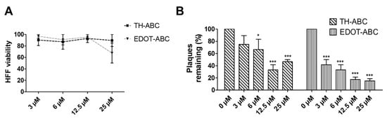 SL derivatives antiviral activity against HCMV. (A) Viability was measured using the MTT assay. Confluent HFF cultures were seeded in 96-well plates and incubated with different concentrations of SLs for 144 h. Graphs are representative of three independent experiments with duplicate replicate wells for each analysis. (B) Antiviral activity of TH-ABC and EDOT-ABC on HCMV replication. HFF cells were pre-treated with the indicated dilutions of SLs for 2 h. Subsequently, the HFFs were infected with the HCMV Merlin strain (MOI of 0.1) and, following virus adsorption (2 h at 37 °C), the viral inoculum was removed and the cultures were exposed to increasing dilutions of either the SLs or vehicle (DMSO) and incubated for 144 h. Supernatants and cell-associated viruses—obtained from freeze (liquid nitrogen)/thaw (37 °C) cycles—were combined, and virus infectivity titers were determined by plaque assay. Plaques were microscopically counted, and the mean plaque counts for each compound concentration were expressed as a percentage of the mean count of the control (*, p < 0.05; ***, p < 0.001, two-way ANOVA followed by Bonferroni’s post-tests).